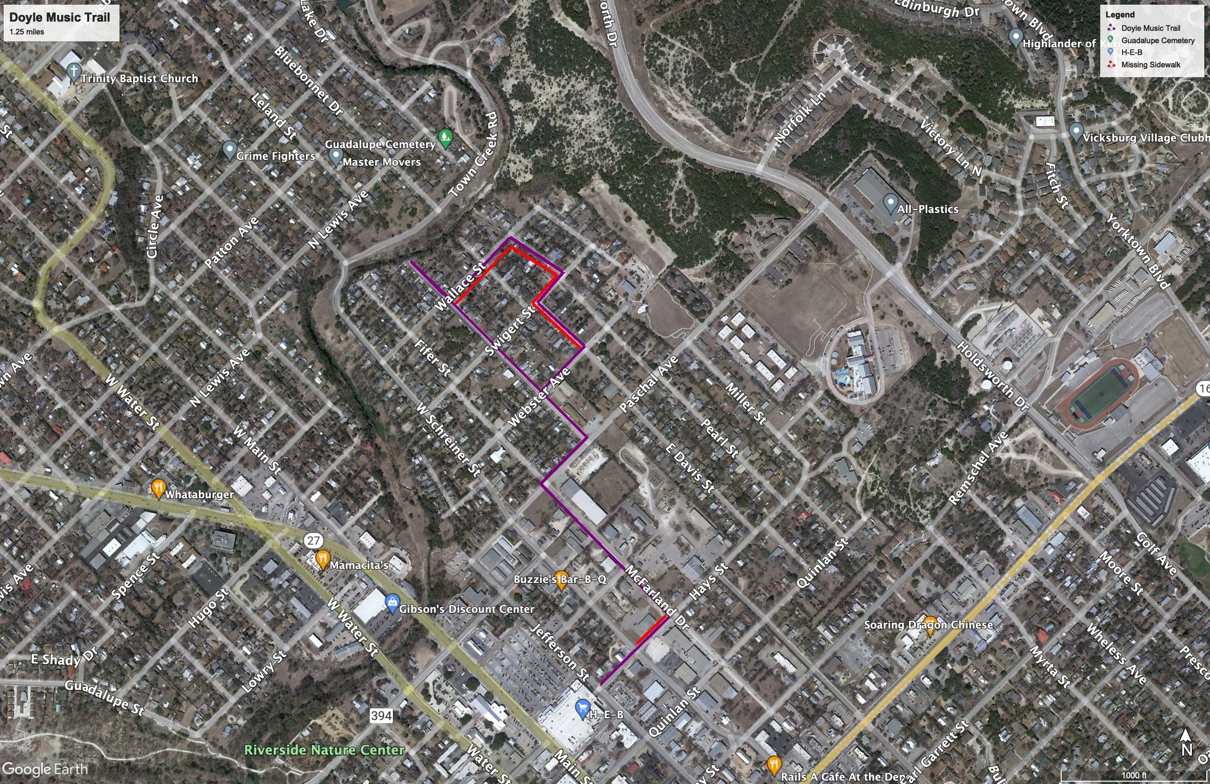 This trail uses custom designed markers to designate culturally significant sites throughout Kerrville's Doyle neighborhood, including the seven historical 'juke joints' that once operated as the community centers of the neighborhood. KUTS: Doyle will connect to KUTS: Clay South via Jefferson and Hays Streets.